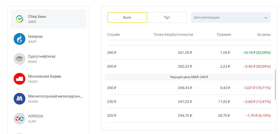 К примеру, сейчас стоимость опциона компании X равняется 177 рублям. Инвестор решил приобрести 25 колл-опционов со страйк ценой в 175 рублей, за что выплатит премию в размере 40 рублей (1,60 рубля за опцион). Тем самым была зафиксирована покупка опциона на будущую дату до истечения всего срока. И за это время цена исполнения поднялась до 258,60 рубля, тем самым клиент получить прибыль: (258,6 — 177) * 25 – 40 = 2 000 рублей. Если цена актива будет такой же или ниже, то инвестор может просто её не покупать. В таком случае клиент брокера потеряет лишь премию по опциону в размере 40 рублей.