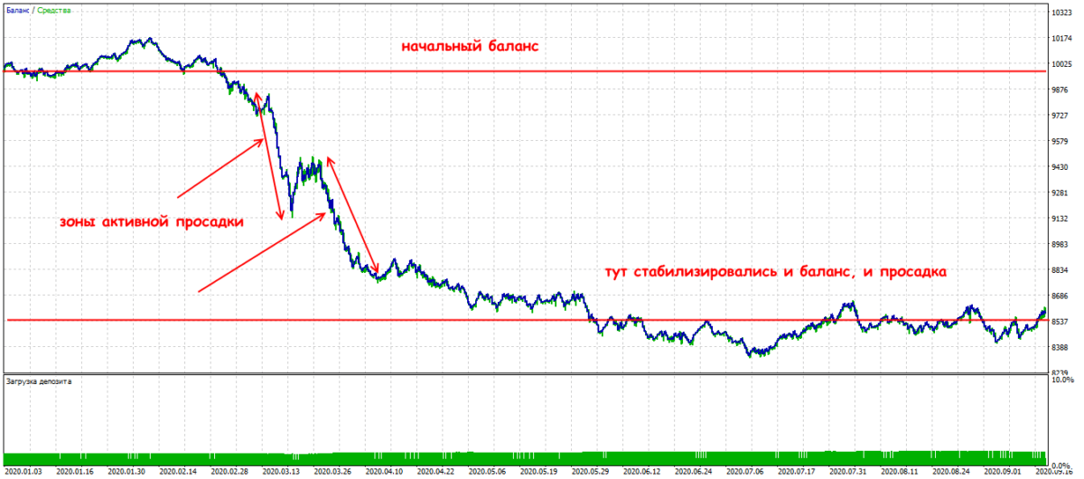 Результат показывает, как уменьшился баланс депозита относительно начального баланса. Считается статистически менее значимым, чем текущая или max-ная, но в реале это психологически сильный показатель, особенно для новичка, так как показывает фактические потери начальных инвестиций.