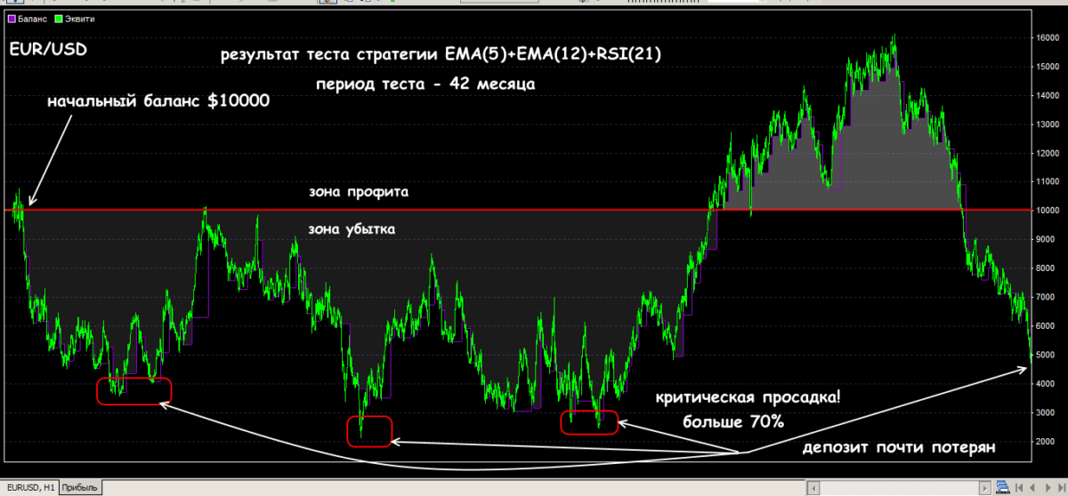 Такой график с регулярными провалами и постоянный риск слива делает профит крайне маловероятным. Ряд последовательных просадок и профитов должен быть равномерным и общая линия баланса должна плавно двигаться вверх.