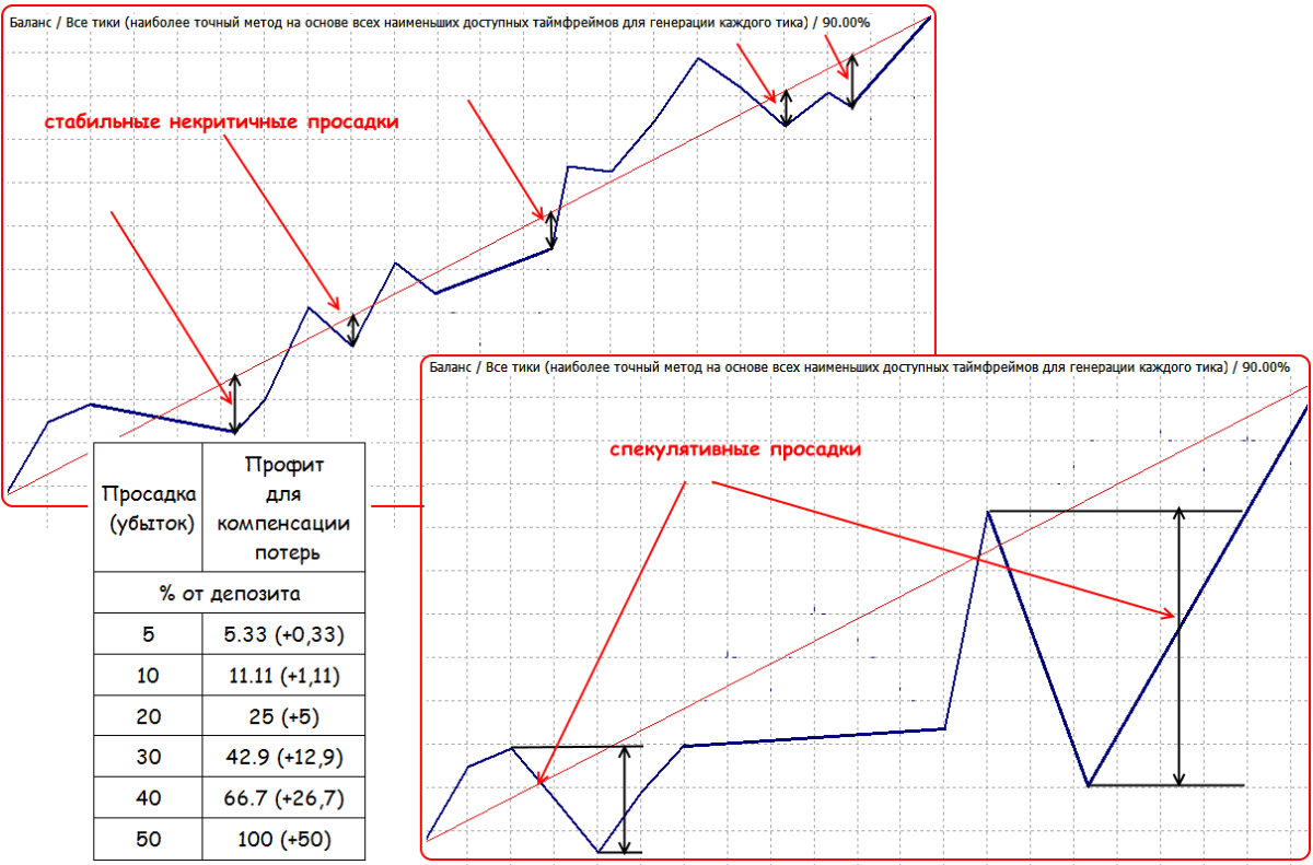 Просадку нельзя держать слишком долго: необходимая сумма профита для компенсации убытка растет, как говорится, с ускорением.