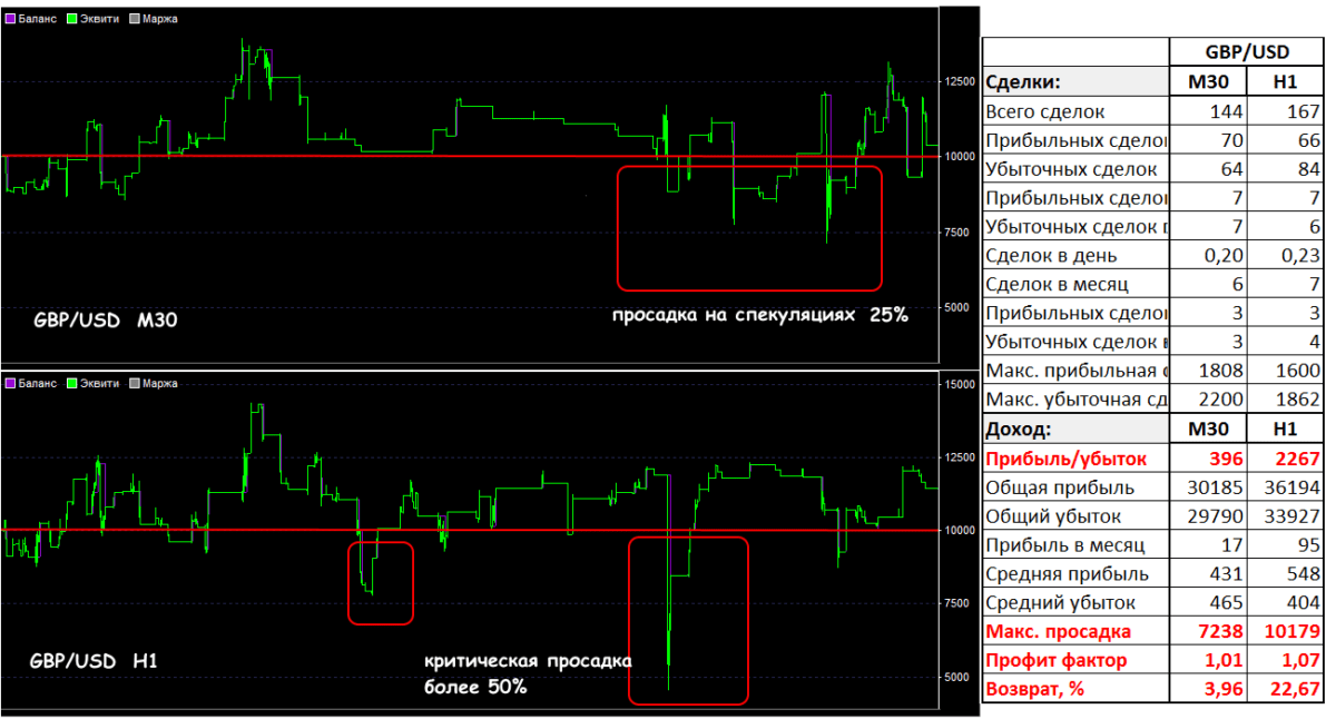 Допустим, тесты двух стратегий в одинаковых торговых условиях (брокер, актив, период) показывают в итоге аналогичный результат, например, 100% профит по EUR/USD за год. Если при этом максимальные потери одного варианта 50%, а второго – 10%, то выбирать нужно методику с меньшим риском, хотя итоговый профит от реальной торговли может быть значительно ниже.