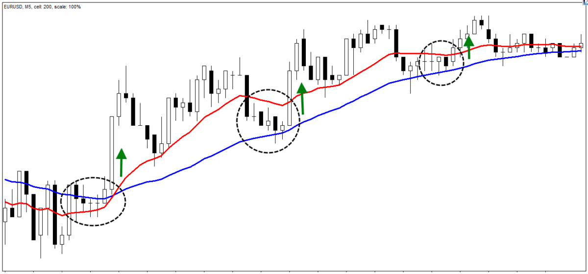 Основная торговая идея: успеть войти в рынок, когда попадает в диапазон между линиями, отталкивается от границ и сразу после этого выходит из этой зоны. Цена не движется между двумя МА дольше 3-4 баров. Примерно так: