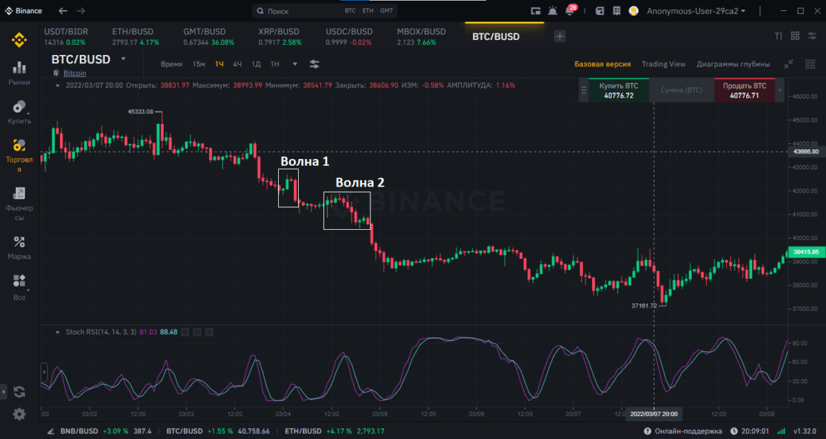Чаще всего на графике встречаются одно- или двухволновые виды коррекций. Далее рассмотрен пример локальной корректировки часового графика BTC/BUSD.