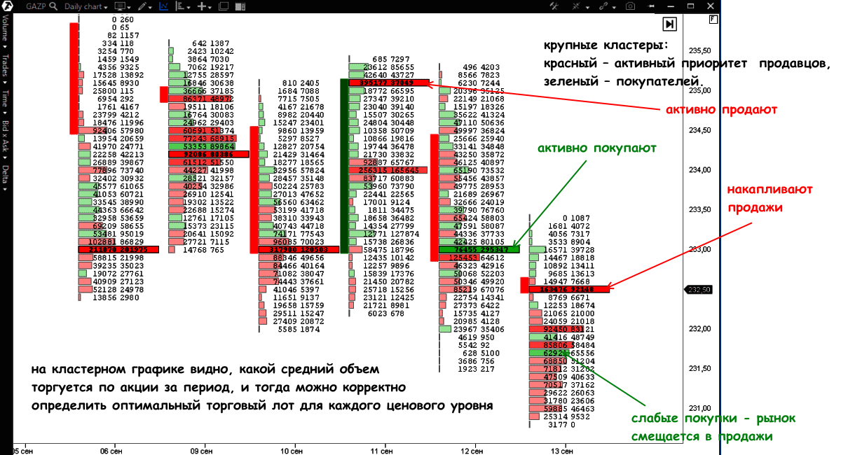 На кластерном графике четко видно ценовые уровни с повышенным объемом.