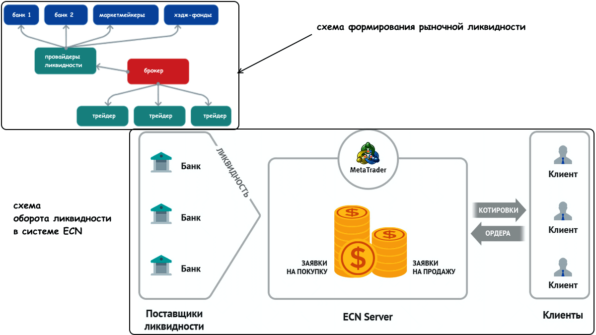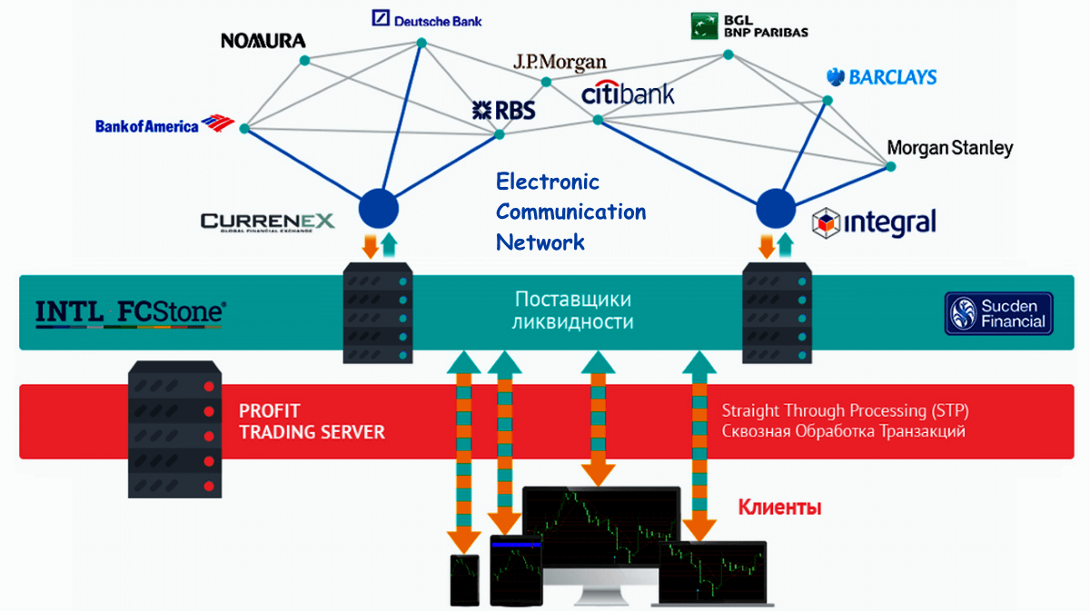 Подключение к глобальным каналам информации гарантирует высокую ликвидность любому брокеру: какая бы цена и объем не понадобился клиенту на покупку − найдется аналогичный контрагент на продажу. Брокер передает агрегатору ликвидности сделки своих трейдеров и все происходит автоматически. В результате ордер закроется по цене, которую предлагает поставщик ликвидности.