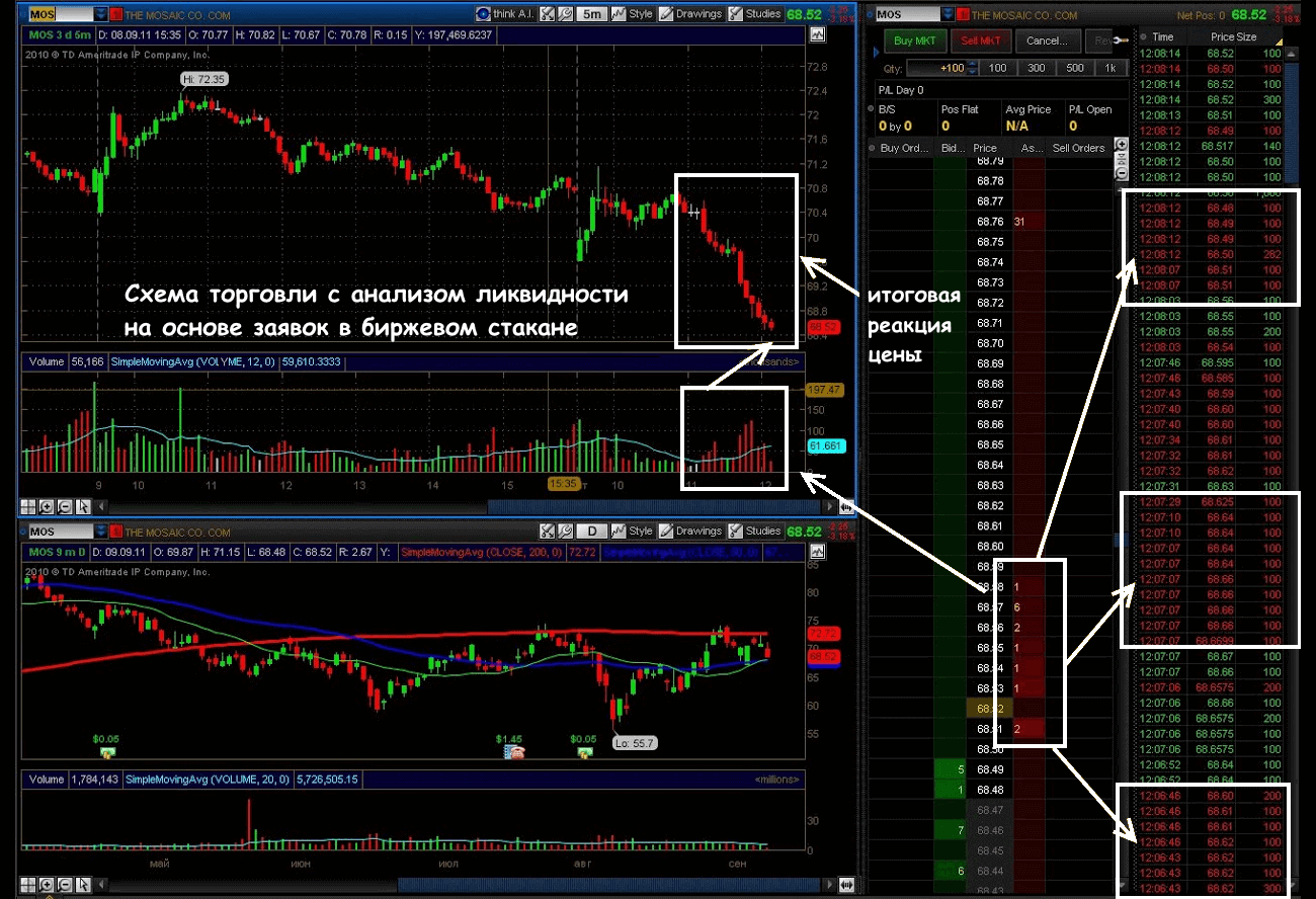 Рыночная цена постоянно ищет баланс, что означает движение до тех пор пока объем покупок не перекроется объемом продаж. Если, например, интерес не компенсируется (продавец не может найти покупателя), значит ликвидности не хватает – на графике это выглядит как слабая волатильность или ряд неперекрывающихся гэпов. Такой рынок – куча проблем: проскальзывание, расширение спреда и сделки по невыгодным ценам. Так что профессиональные спекулянты, даже торгующие в обычных MT4 или MT5, следят за выбранным активом в биржевых терминалах и входят в рынок только при появлении в стакане крупных игроков.