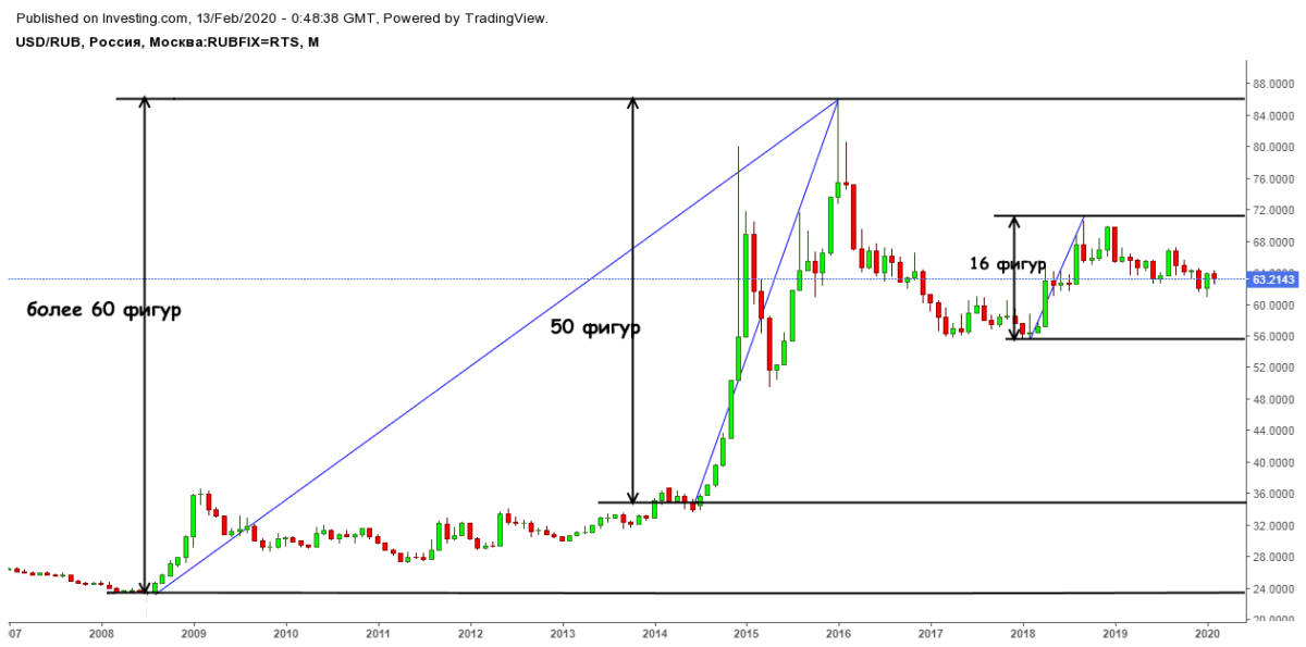За последнее десятилетие базовая пара USD/RUB прибавила более 60 фигур, но уже 2-3 года диапазон волатильности не превышает 16-ти, причем сильного долгосрочного тренда нет.