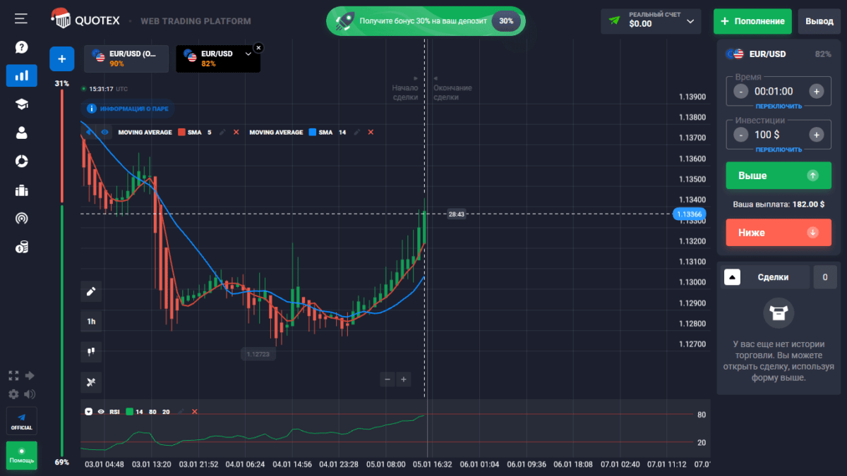 Используя технический анализ, наложим на график скользящие средние с периодом 5 и 14, а также RSI продолжительностью 14 и границами 80-20. При такой комбинации индикаторов можно идентифицировать восходящий тренд – об этом говорит пересечение «короткой» средней второй линии снизу вверх. Значит имеем дело с тенденцией на повышение. RSI подтверждает возможность открытия бычьей сделки, однако предупреждает о риске скорого угасания тенденции, рисуя свою контрольную линию у верхней границы. Еще больше мощных индикаторов для работы можно найти в специальном разделе по ссылке. Здесь к каждому отдельному инструменту приводится подробная инструкция, облегчающая обучение техническому анализу в разы. Отличные результаты приносит анализ на основе ценовых каналов. Линии сопротивления и поддержки помогают найти лучшие моменты для входа, одновременно предлагая дальнейшее направление вектора развития.