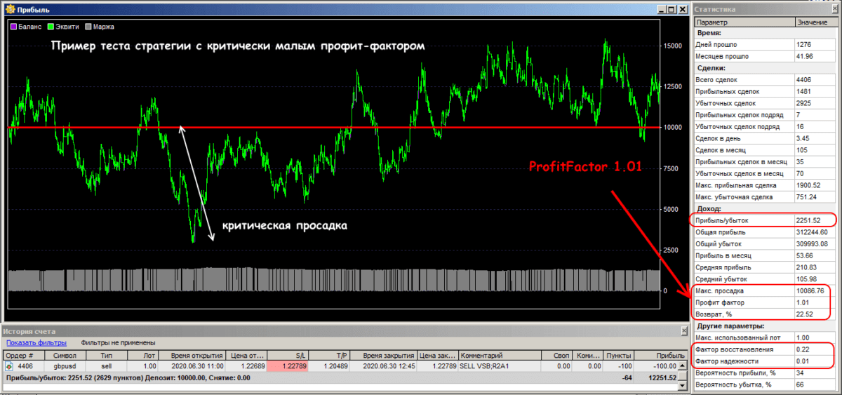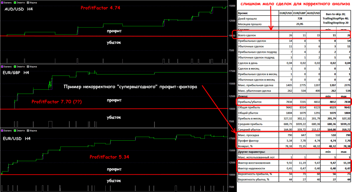 Сразу напомним: профит-фактор некорректно оценивает потенциал торговой системы при малом количестве сделок. Это может быть вообще случайный результат – положительный или отрицательный – и использовать такую статистику на реальном счете нельзя.