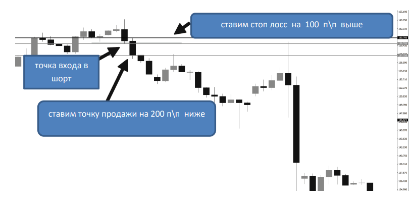 Допустим, что имеется покупка актива в короткой позиции (шорт) (см. рис.). Одновременно с этим был установлен лимитный ордер на продажу на 100 единиц больше той цены, по которой приобретался актив на бирже. Цена, по которой фиксируется прибыль, будет на 200 единиц меньше, цены его приобретения.