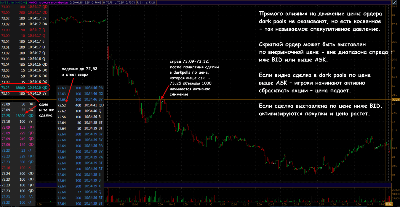 Для бирж США теперь действуют специальные правила FINRA, в соответствии с которыми примерно 40% информации о сделках в «темных пулах» должны быть видны всем в обычном биржевом стакане. Поэтому даже если вы торгуете чем-то банальным, типа валютных пар, нужно искать информацию о биржевых объемах и анализировать расстановку крупных ордеров.