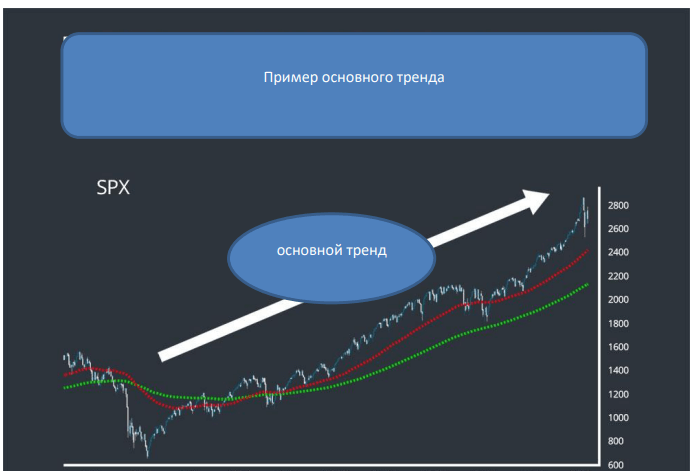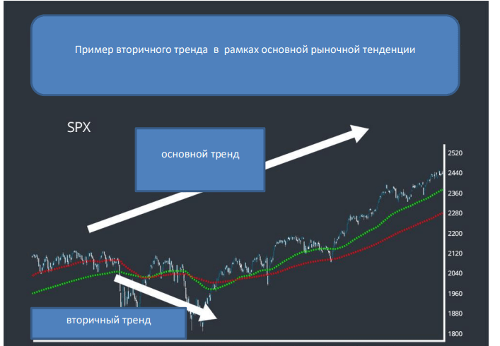 - Первичный тренд — это главный тренд рынка. Он показывает, как рынок движется в долгосрочной перспективе. Первичная тенденция может длиться многие годы. Это связно с глобальной денежной политикой — ужесточения или смягчения, таргетирование инфляционных процессов или наоборот — их расширения.