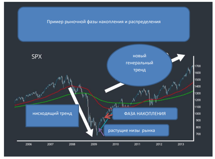 С технической точки зрения, начало фазы накопления — это когда нисходящий первичный тренд начинает делать более высокие минимумы, а затем, наконец, достигает более высоких максимумов.