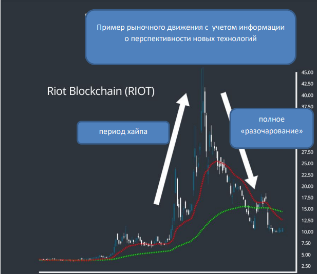Многие трейдеры идут против этого мнения и торгуют акциями, основываясь на слухах и новостях. Примером ажиотажа и новостной рекламы является Riot Blockchain (RIOT), биотехнологическая компания, решившая заняться технологией блокчейн. Сюда же можно отнести и хайп вокруг Биткоина в 2017 году и его феерическим падением уже через 6 месяцев.