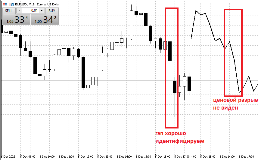 Одно из главных отличий тиков от баров – неразрывность первых. Если к окончанию торговой сессии, особенно в конце недели, японские свечи могут рисовать горизонтальные штрихи, отражая неготовность трейдеров к активным действиям, на простом линейном тренде таких флуктуаций не будет видно, пока не появится нового результата. А с началом новой рабочей недели котировки начнут движение от предыдущих точек. И даже если произойдет ценовой разрыв, на тренде появится длинная линия определенного направления, но идентифицировать появившееся ценовое окно онлайн будет сложно. Ниже приведен конкретный пример возникновения подобной ситуации.