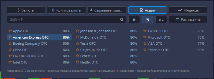 Предлагает возможность торговли более чем сотней различных активов, от валютных пар до индексных и сырьевых инструментов, а также бумаг фондового рынка.