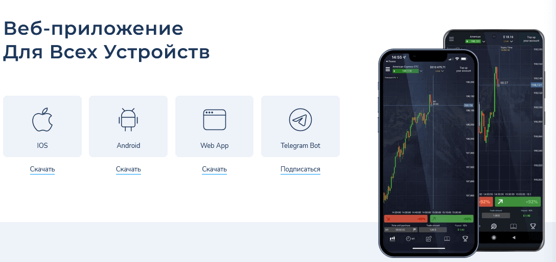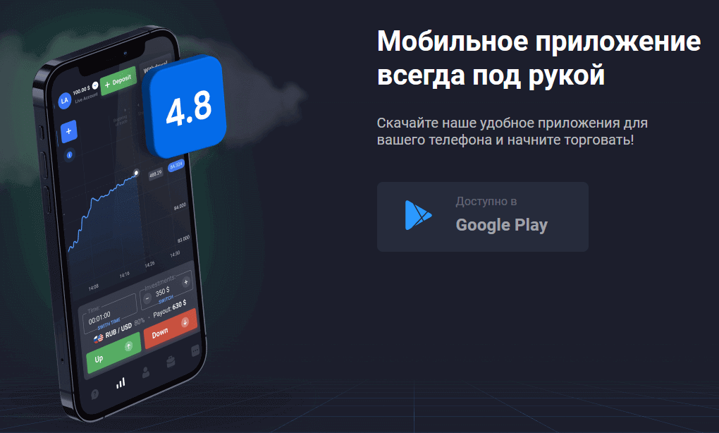 Помимо веб-версии терминала владельцы Android устройств могут использовать на своих гаджетах мобильное приложение, ссылка на его скачивание располагается в разделе личного кабинета официального сайта. По умолчанию функционал позволяет настраивать 1-кликовый стиль торговли, подходящий для многих скальперских стратегий, а также формирование позиций по системе Мартингейла. Регистрация учебного аккаунта занимает несколько минут, пополнение и вывод средств на реальные депозиты производится без комиссии.