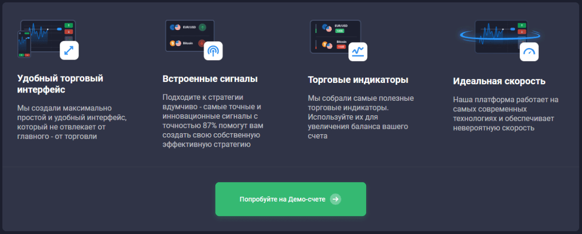 Основной посыл приложения – максимальная клиентоориентированность, использование интерфейса предполагается удобным для широкого круга пользователей. С таким функционалом можно всецело сконцентрироваться на торговле, не отвлекаясь на детали. Новичкам форсировать процесс обучения помогут генерируемые на бесплатной основе сигналы, с помощью которых можно не только научиться принимать взвешенные решения по открытию сделок, но и зарабатывать, не прикладывая к этому собственных аналитических усилий, а следуя советам профессионалов. Разработчики обещают высокую скорость отклика при любых сценариях развития рыночной ситуации, и во многих отзывах полностью подтверждается этот факт.