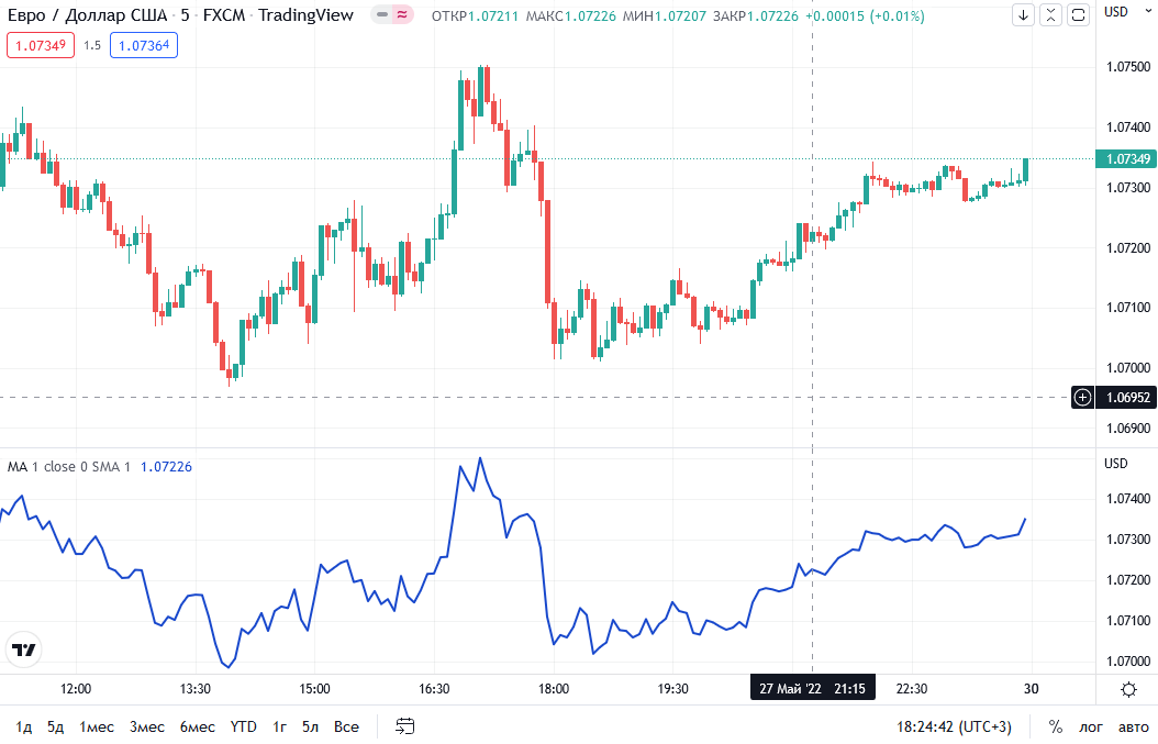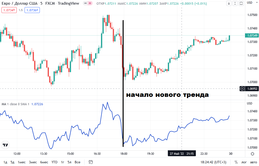 Ниже показан пример отображения простой средней линии на онлайн графике евро-доллара с пятиминутным таймфреймом в программе Tradingview. Так как тренд бинарных опционов полностью повторяет движение основного актива, правила идентификации всех компонентов метода полностью идентичен классической концепции для валютной секции и «бинаров».