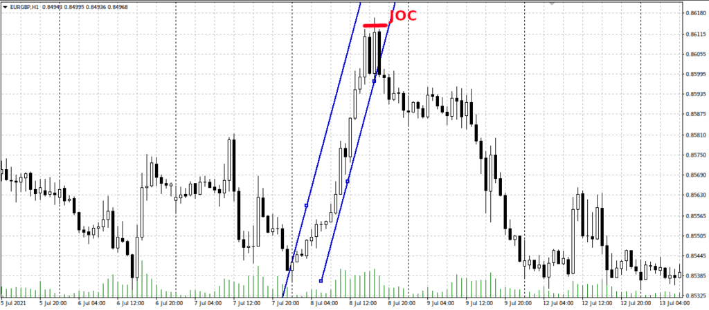 - Jump over Creek. Когда мощная возрастающая или падающая свеча пробивает текущий канал это относится к модели JOC. Главное условие — формирование минимальных (максимальных для падающей свечи) цен должно быть максимально близко ко второй границе канала, не касаясь ее. Часто возникают случаи, когда пробив линию поддержки или сопротивления, на следующем баре котировки возвращаются в прежние границы. Такой паттерн носит имя Back to Creek (BTC) и может возникать совместно с JOC в пределах нескольких соседних баров. Инструкция для открытия позиции — входить в сделку даже если граница канала не достигнута. Стоп-лосс устанавливается на уровне, либо на небольшом удалении от границы.