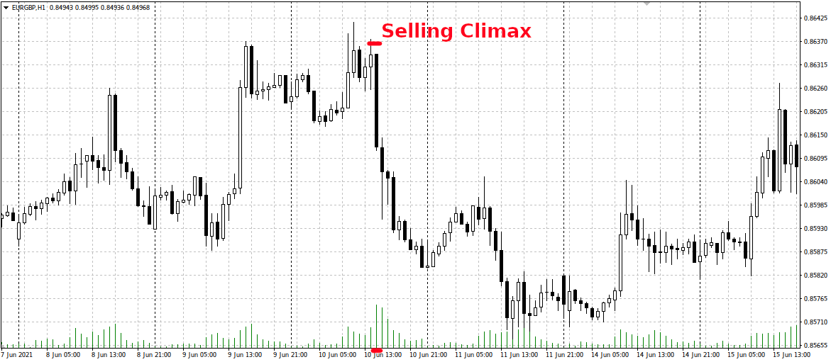 - Selling Climax. Название этой части побарного анализа в полной мере характеризует панические состояния. Визуально ситуация описывается как высокий бар с небольшими тенями или их полным отсутствием. В реалиях эта модель означает, что владельцы значительных позиций приступили к их ликвидации, вызвав падение котировок и задав тон старту распродаж. Та же ситуация, но в зеркальном отражении характерна для Buying Climax. По аналогии с классической теорией подобные формации — часть разворотного паттерна двойной вершины или основания. Главное условие — рост числа открываемых позиций на разворотном баре.