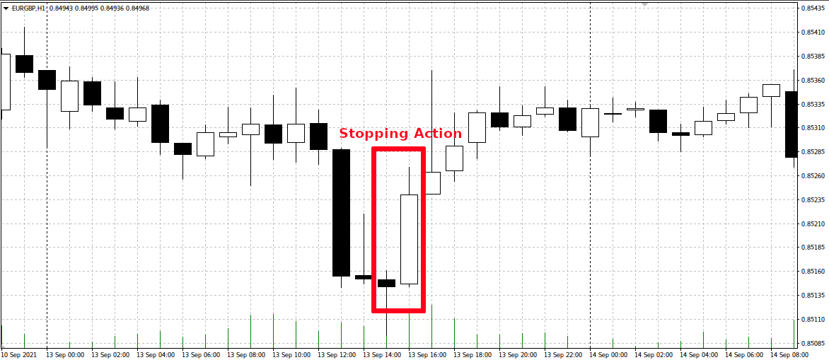 - Stopping Action. Схожа с фигурой поглощения. Происходит после появления бара с длинными тенями и небольшим телом. Чем ближе тело к максимуму на растущей свече и к минимуму на падающей, тем выше вероятность отработки этого паттерна биржевой толпой.