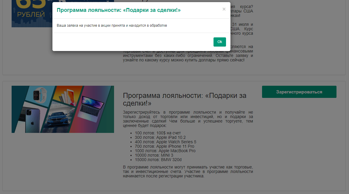 Зарегистрировавшись в программе лояльности, трейдер может получать специальные подарки за совершенный оборот по закрытым сделкам. Всего доступно 7 видов призов: от $100 бесплатных долларов на баланс до автомобиля BMW 320d. Полный перечень подарков смотрите на скриншоте ниже.