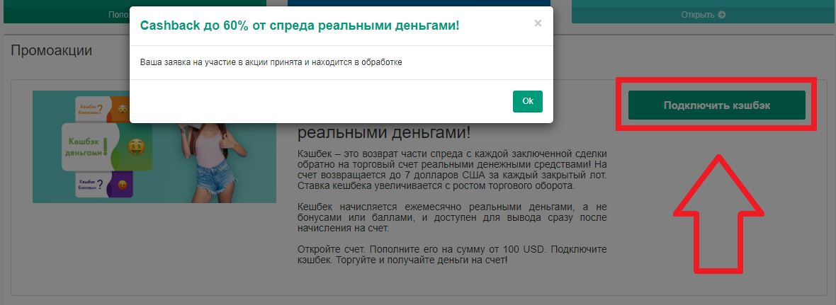 Данное предложение представляет собой кэшбэк комиссии, взимаемой брокером в виде спреда — разницы между покупкой и продажей актива (цены Bid и Ask). Для участия в этой акции необходимо зарегистрировать реальный торговый счет, пополнить его минимум на $100 или 5 000₽, после чего нажать кнопку «Подключить кэшбэк» рядом с описанием программы на промо странице. Также нужно направить на специальный адрес электронной почты письмо с просьбой подключения аккаунта к программе.