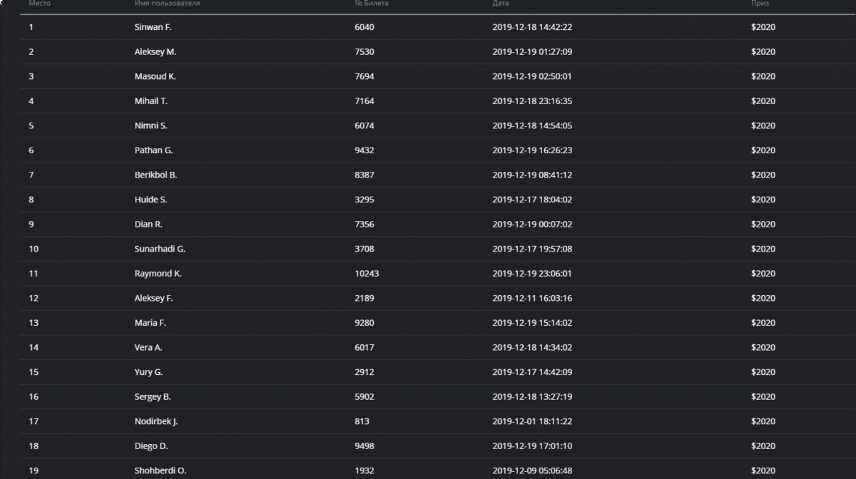 Всего брокер выделил 202000 долларов США для новогодней лотереи. Выигрыш получат первые 100 мест. Каждому достанется по 2020 долларов США.
