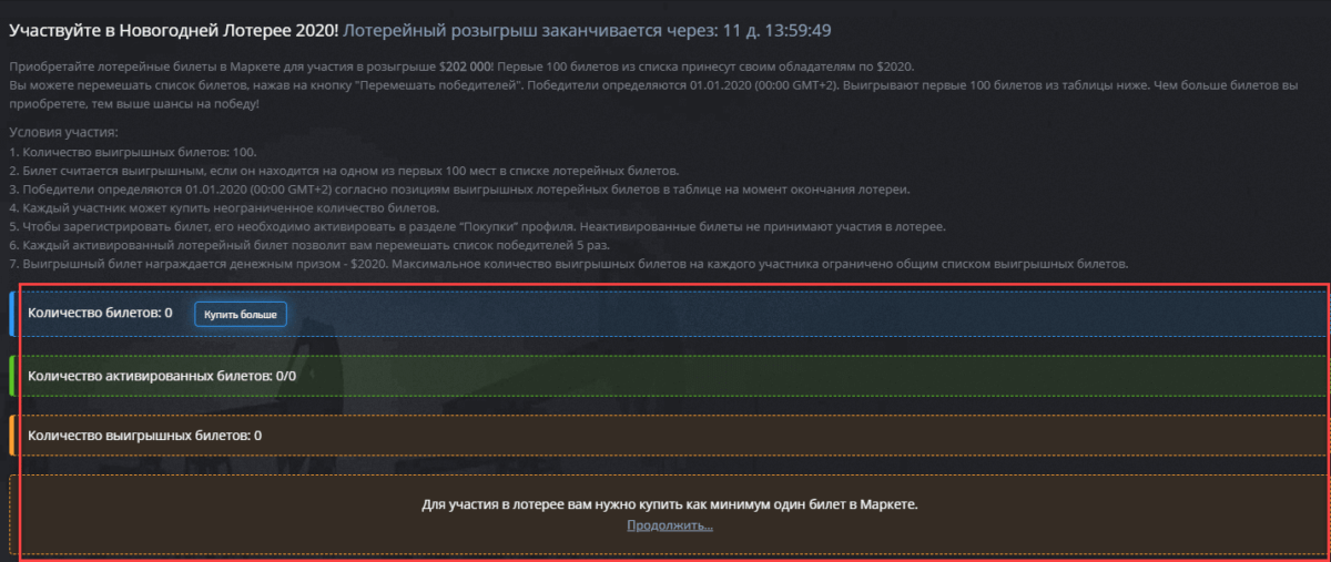 Слева от описания условий акции представлена информация в цифрах. Можно узнать общее количество билетов, купленных на данный момент, количество участников и перемешиваний, которые уже сделаны клиентами брокера.
