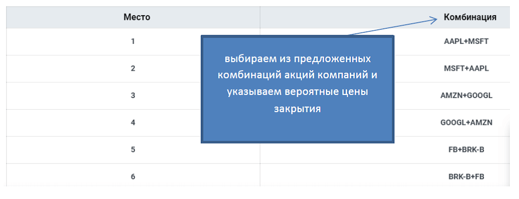 В этом списке будет предложена комбинация из двух ценных бумаг американских корпораций. Например, акции «Тесла» и «Американ экспресс». Участнику нужно указать наиболее вероятные, по его мнению, цены закрытия на момент первой пятницы месяца. Например, 100 и 200. Далее складываются цены этих двух акций, и получается финальная комбинация цифр — 100200. Эта комбинация, если она будет наиболее близкой к реальным ценам закрытия на бирже, то заявивший ее участник признается победителем.