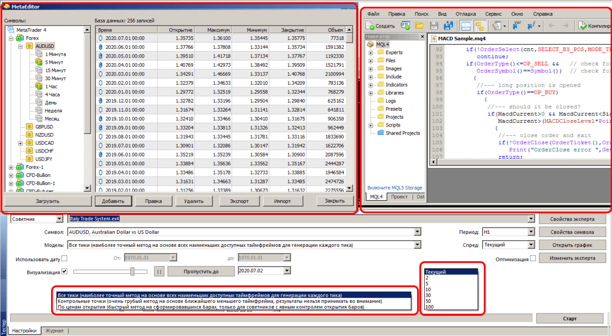 Предполагаем, что наш читатель имеет хотя бы начальный опыт, отметим только наиболее важные опции тестера стратегий Форекс, подробнее – читайте встроенную помощь по MetaTrader 4 (5).