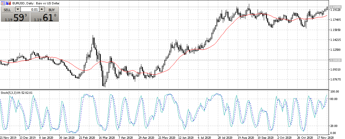 Метод предполагает использование MA в качестве основного, а Стохастика — подтверждающего инструмента.