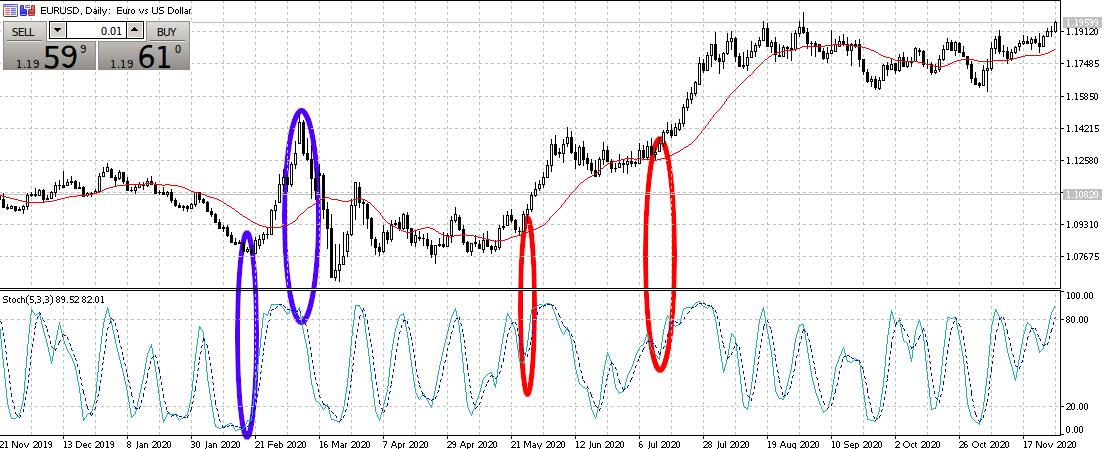 Красные овалы — моменты для входа, когда выполняются все описанные ранее правила. Здесь и скользящая и показания стохастика говорят о необходимости открытия ордера на покупку. Синие овалы — когда развитие ситуации не соответствует всем правилам. В первом случае стохастик давал сигнал на открытие, но цена находилась глубоко под уровнем MA, что сохраняло риски отскока котировки от сопротивления. Подтверждали это и небольшие размеры тел свечей, которые говорили лишь о робких попытках быков перехватить инициативу.