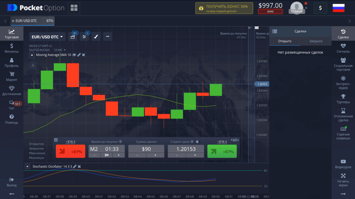 В качестве основного таймфрейма используется минутный график. В бинарах выставлять периоды дольше 4-часового не имеет смысла, так как максимальный период экспирации в большинстве случае ограничен этим временным интервалом. При наложении индикаторов на график получаем такие же четкие сигналы, как и на других рынках. Только интерпретировать их надо не как указание к действию, а как сигнальный уровень. Если цена находится выше MA, сигнальная часть стохастика пересекла основную снизу вверх — можно открывать позицию на покупку. Справедливо обратное и для операций с продажей актива.