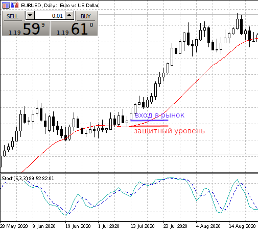 Наилучшее время для открытия ордера — на следующем баре после пересечения скользящей средней графиком. В этот момент уже понятен новый тренд, он подтвержден как самой ценой, так и стохастическим осциллятором. Стоп-лосс рекомендуется ставить на уровне в несколько пунктов ниже точки пересечения скользящей и цены, чтобы исключить закрытие ордера из-за временной ценовой флуктуации при откате тренда к предыдущим уровням в момент срабатывания защитных ордеров других участников. На картинке выше оба уровня отображены наглядно. Неоспоримое преимущество — небольшая дельта между ними при высоком потенциале получения профита.