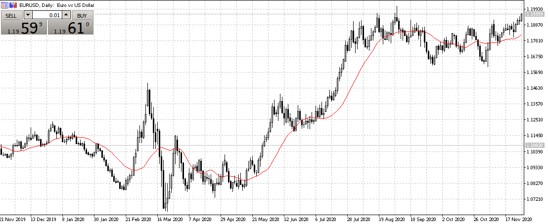 - Moving Average. На периодах в 1 день и более рекомендуется использовать период 21 и более, на менее долгосрочных — 14, или 7 для минутных графиков, соответственно. С помощью нее определяем текущее состояние тренда — нахождение котировки под индикатором характеризует нисходящий тренд, над — восходящий. Подробно все нюансы работы и тонкости настройки MA рассмотрены в отдельном материале по ссылке и при необходимости могут быть установлены в любом значении. Линия строится по простому методу (а не сглаженному или экспоненциальному). Рекомендуется использовать котировки закрытия в качестве исходных данных.
