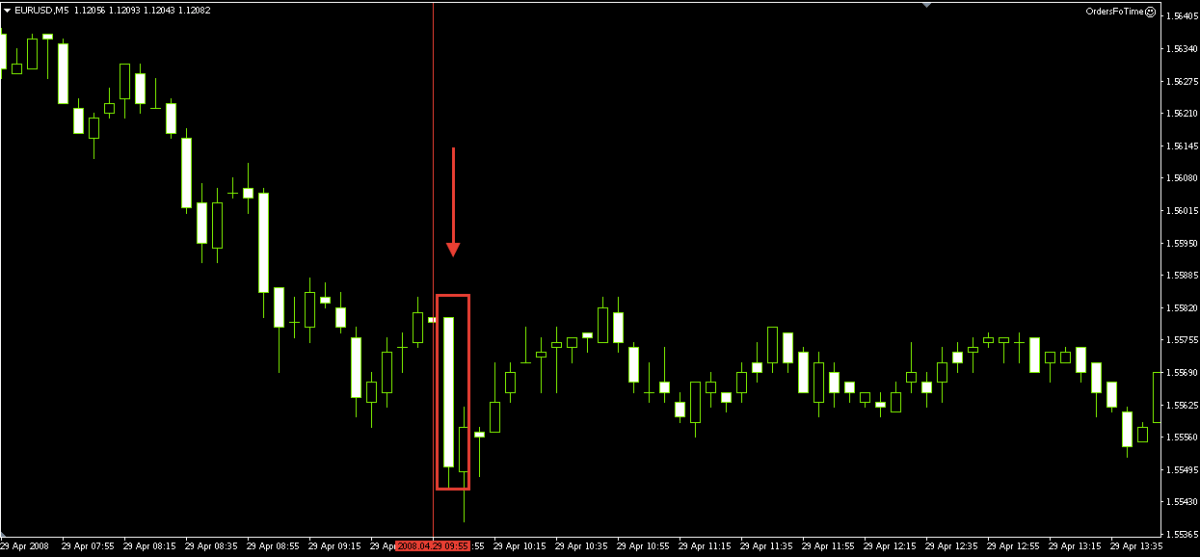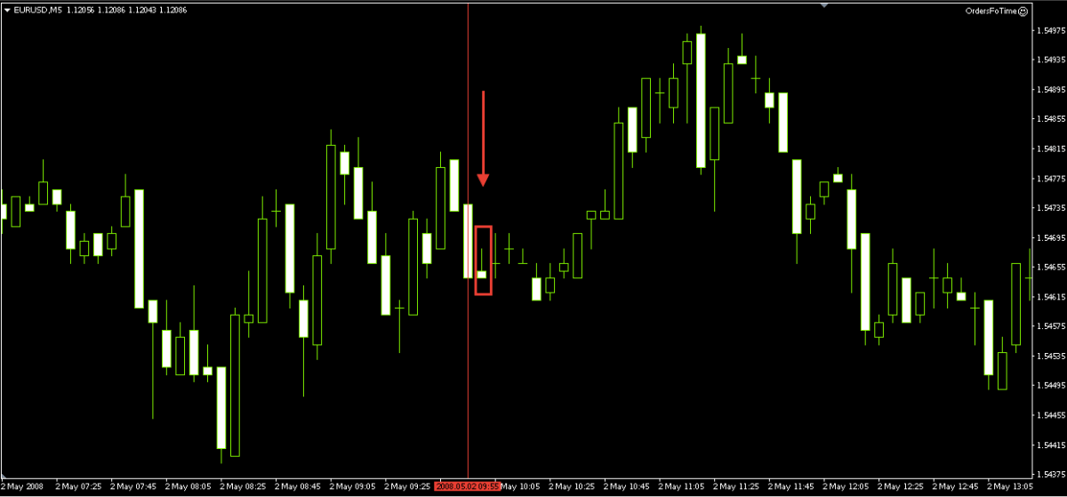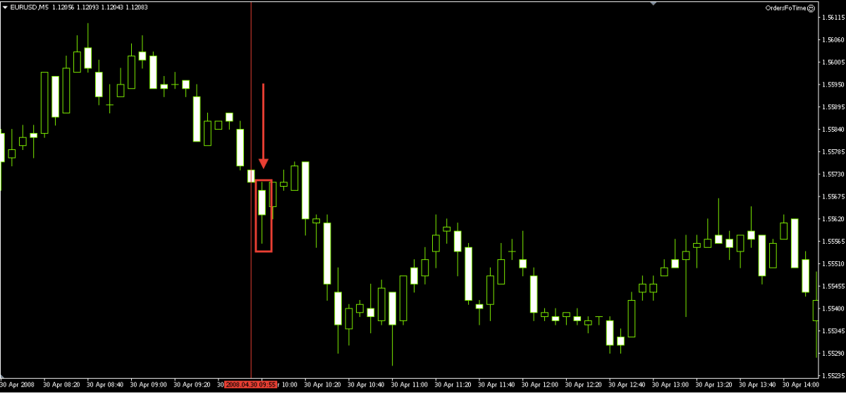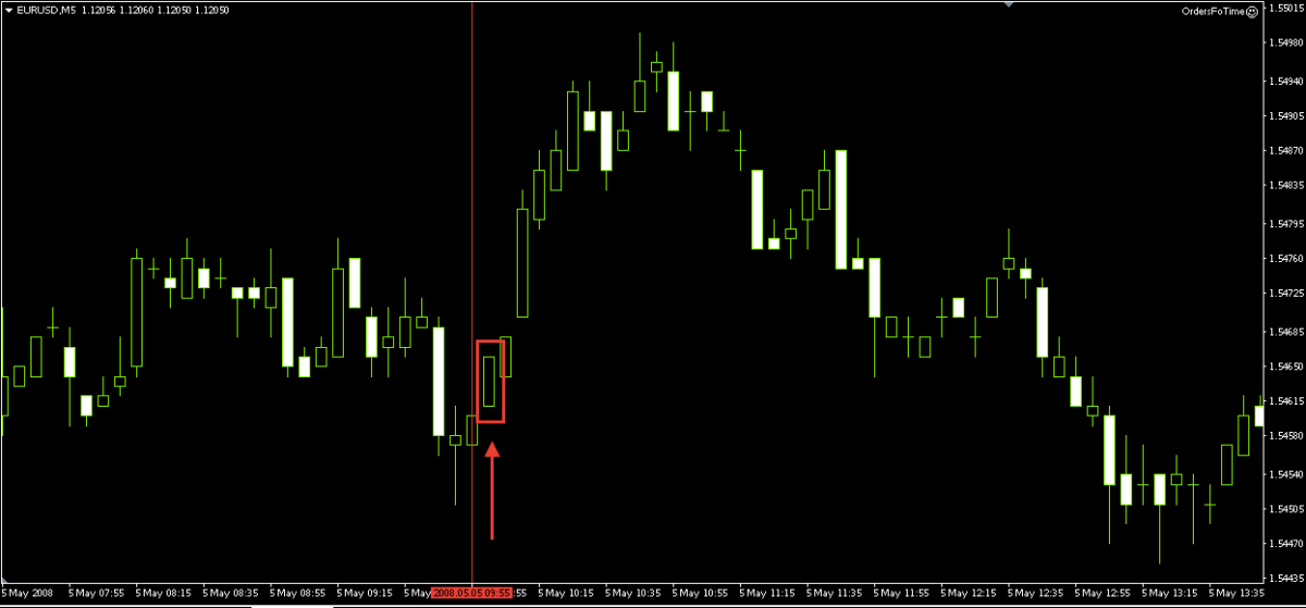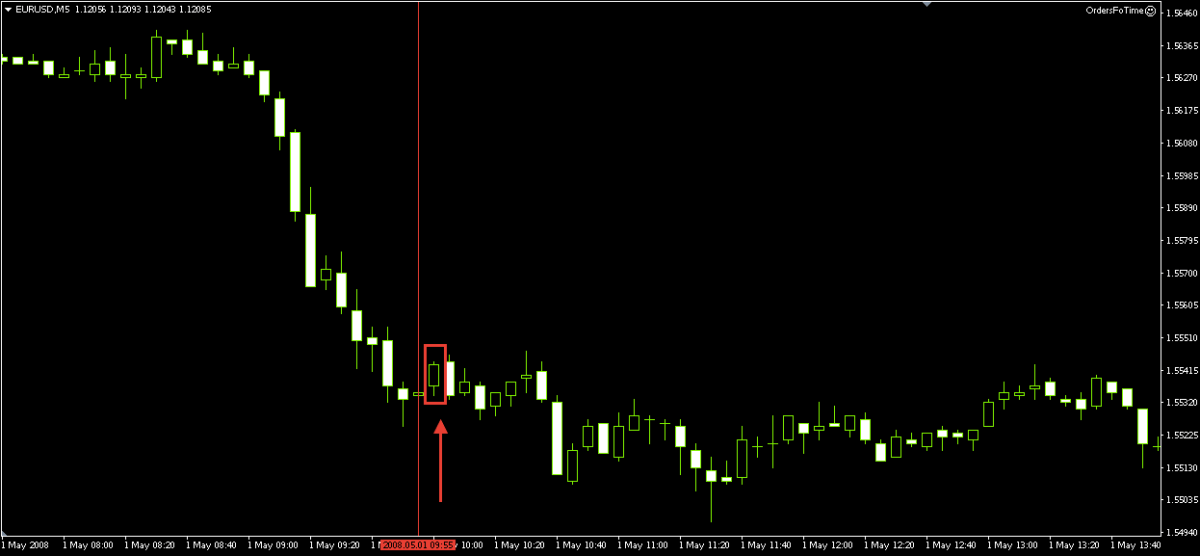 - Если сформированная в 09-55 свеча на графике М5 по EUR/USD восходящая, то свеча на 10-00 тоже будет восходящей с вероятностью 95%. Дело в том, что именно свеча на 09-55 отображает настроения британских трейдеров. К этому моменту уже собраны все отложенные заявки и рынок на них начинает реагировать.