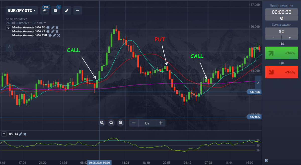 Конечно, в сделках на М30 психологическое давление на трейдера значительно меньше, но риски потерь все равно очень высокие. Трендовые индикаторы хороши для Форекс, но для БО их точности явно не хватает. Тем не менее, получасовые методики гораздо надежнее любого скальпинга, и если у вас есть опыт такой торговли, оставляйте свои отзывы − нам важно ваше мнение.
