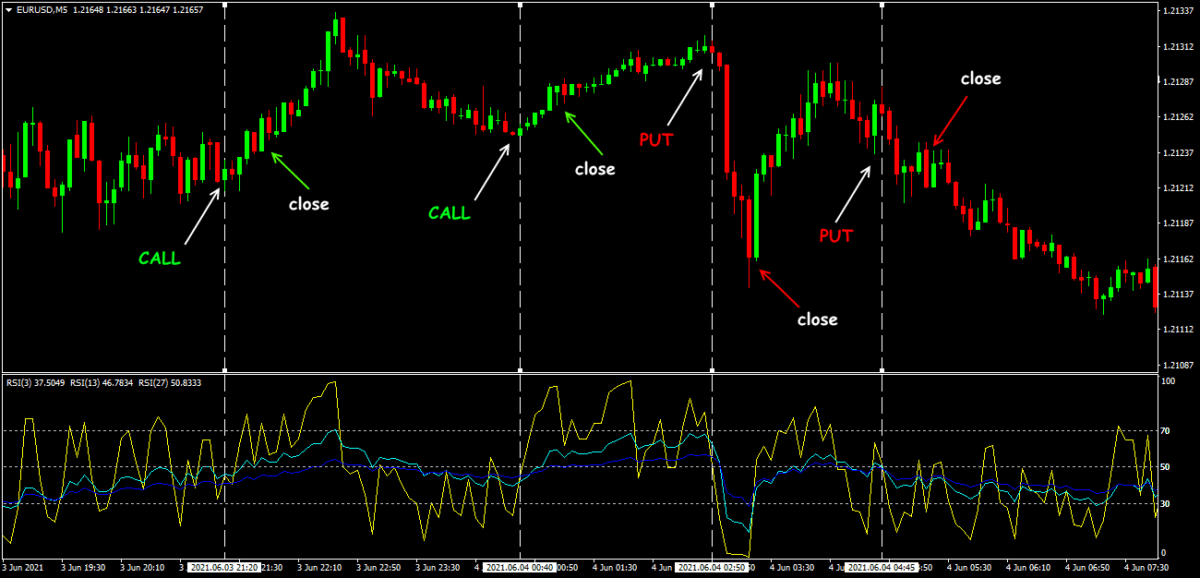 Индикаторы: RSI(3), RSI(13), RSI(26). Входим на М5, время экспирации − М30. Для анализа используем терминал Форекс.