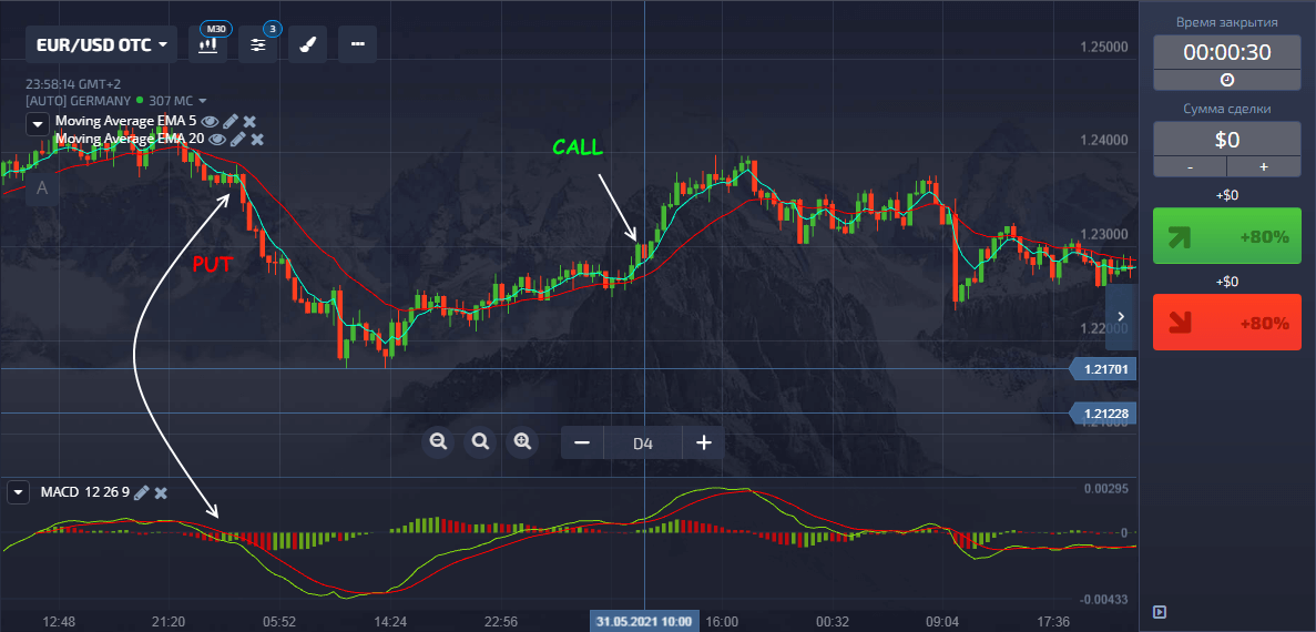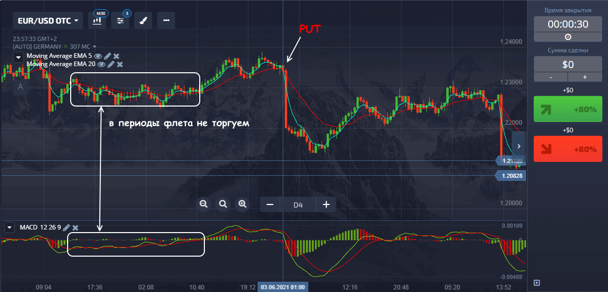Опцион на понижение: быстрая MA пересекает медленную сверху вниз, цена закрывается ниже EMA(5). Гистограмма MACD ниже линии баланса.