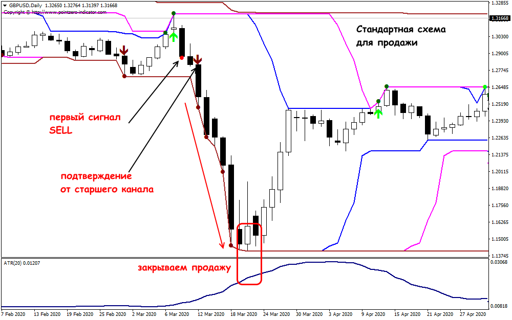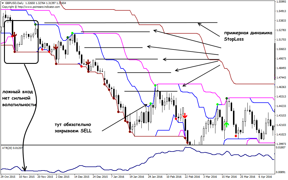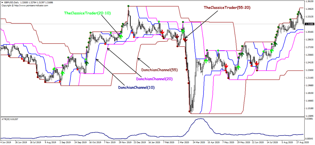 Если совсем кратко: тренд отслеживается на канале в 20 и 55 баров, вход в момент пробоя. Выход – обратный пробой того же интервала. Пробой определяем по TheClassicTurtleTrader: зеленые Стрелки(вход) и Точки(тренд) показывают вход на покупку, красные Стрелки +Точки показывают ситуацию для продажи. Динамика линии ATR используется для определения уровня StopLoss.