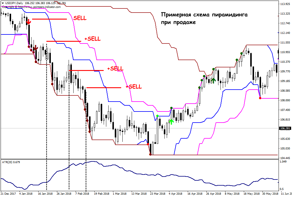 Черепахи с их 1 прибыльной сделкой на 3 убыточных никогда бы не выжили на рынке, если бы не использовали агрессивные методы управлении объемом, в частности, «пирамидинг». Все просто: открываем дополнительные сделки до тех пор, пока идет сильный тренд в сторону профита. Классики использовали понятие юнита (units), которым измеряли объем лота – фиксированный (в деньгах) или динамический (например, в % от депозита).