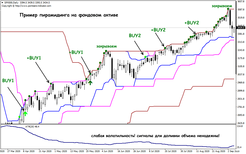 Решение об открытии дополнительных сделок должно поддерживаться текущей волатильностью, но как раз это условие часто не выполняется. Выше приведен тренд 2020 года по S&P500, который показывает минимальный диапазон на ATR, но ведь этот тренд достаточно сильный, и фундаментальные факторы это как раз и подтверждают. Так что современным Черепахам игнорировать комплексный анализ рынка не рекомендуется.