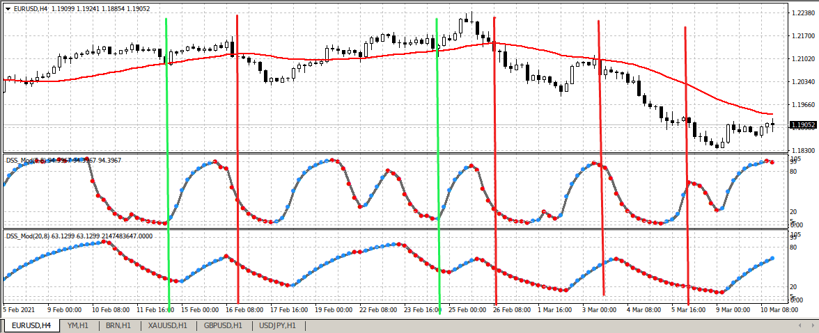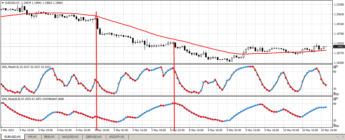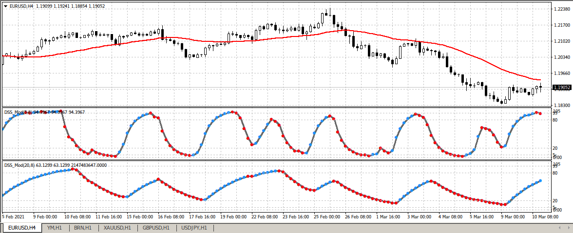 Сам по себе индикатор DSS мод представляет комбинацию средней линии и Стохастика. Указанные выше параметры определяют именно их периоды на графике. Как и положено стохастическому инструменту, DSS показывает состояние рынка с учетом уровней перепроданности или перекупленности.