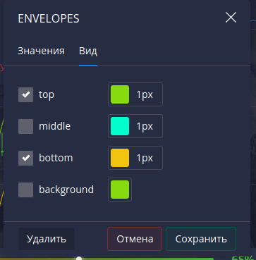 В открывшемся окне устанавливаем период в 3 (по стратегии), во вкладке «Вид» убираем галочки с полей «Middle» и «Background». Нажимаем «Сохранить».