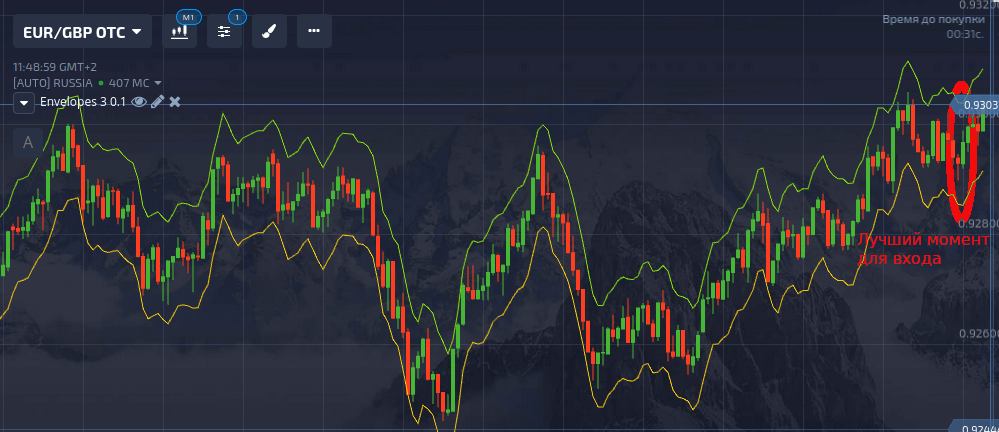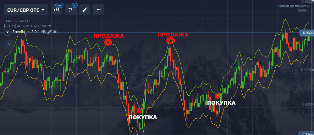 В зависимости от расположения границ коридора, система может выдавать советы на покупку и продажу. Особенно ценные из них получаются в момент перехода тренда от бычьего к медвежьему, и наоборот. На рисунке ниже обозначены подобные моменты. В эти периоды можно гарантированно «поймать» нужный тренд, а в случае, если внутри коридора начнет формироваться свеча в обратном направлении, оперативно среагировать на это, открывшись в соответствии с новыми условиями.