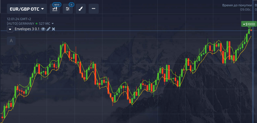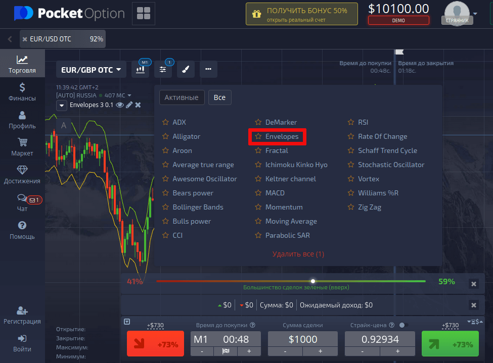 Настройку терминала начинаем с добавления инструментов на график. В идеале необходимо добавить две скользящие средние с периодом 3 по ценам открытия и закрытия. В терминале от Pocket Option на данный момент выбирать тип используемых цен нельзя, поэтому воспользуемся инструментом со схожим функционалом — Envelopes. Таким образом, у нас будет отлично адаптированная система. Полная информация об этом индикаторе представлена в рубрике с обзором технических инструментов на нашем сайте. Далее подробно рассмотрим пошаговую настройку.