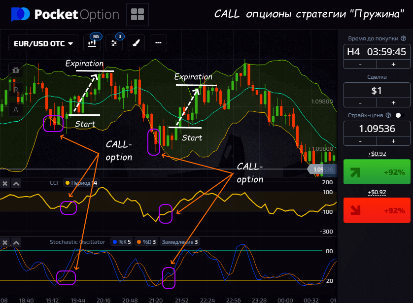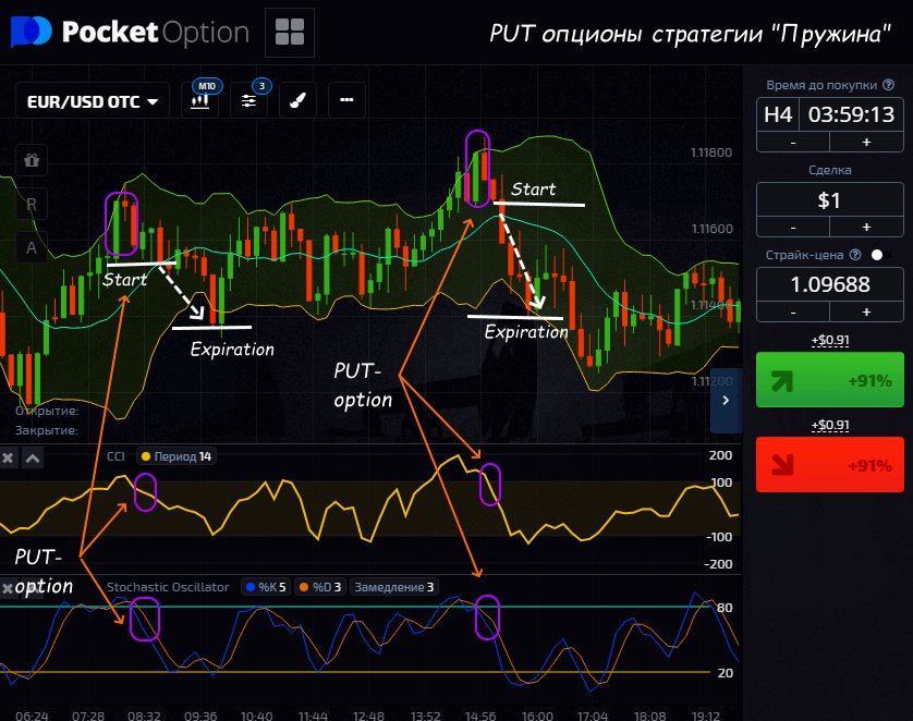Бинарные опционы, имеющие фиксированный срок действия (экспирацию) требуют точного определения момента открытия хотя на первый взгляд все просто и нужно только нажать кнопку «Вверх/Вниз». Не ошибиться помогут стандартные инструменты технического анализа, как это делает стратегия «Пружина».