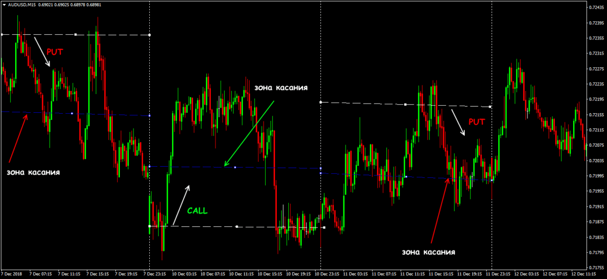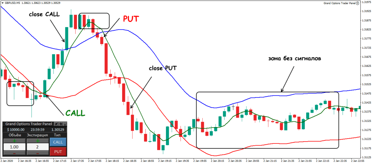 Опцион открывается в случае выхода цены за пределы канала, на откате. Срок экспирации – не более 5-10 баров.